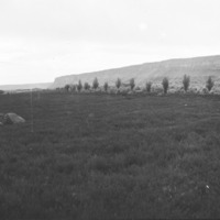 - Panoramic view of fields and trees at the bottom of the canyon.