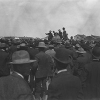 - Panoramic view of a drawing for town lot, with a large crowd of in front of a land office building. In the center of the crowd several people stand on a platform, including a young boy.