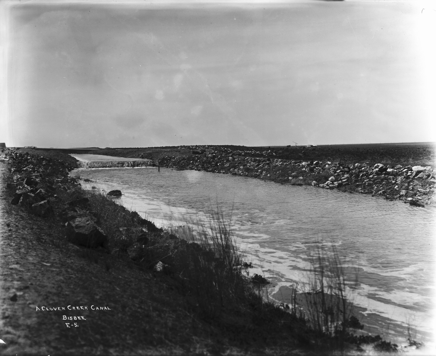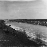 "A Clover Creek Canal;" a view of a canal lined with rocks. Outbuildings and a derrick in the background.