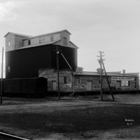 Gooding Milling and Elevator Company; a large grain elevator, warehouse, and train cars, near the railroad tracks.