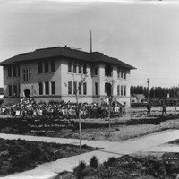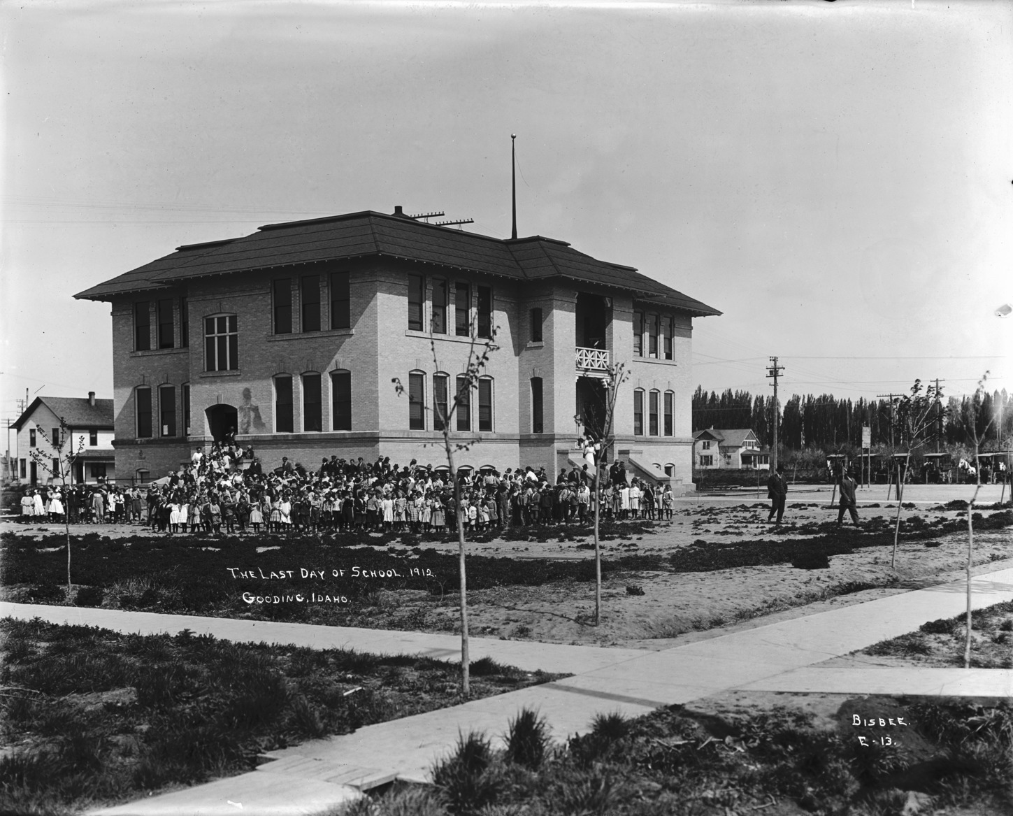 "Last Day of School, 1912. Gooding, Idaho;" a group of children pose in front of a three story brick school. Other houses and several wagons with horses can be seen in the background.