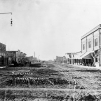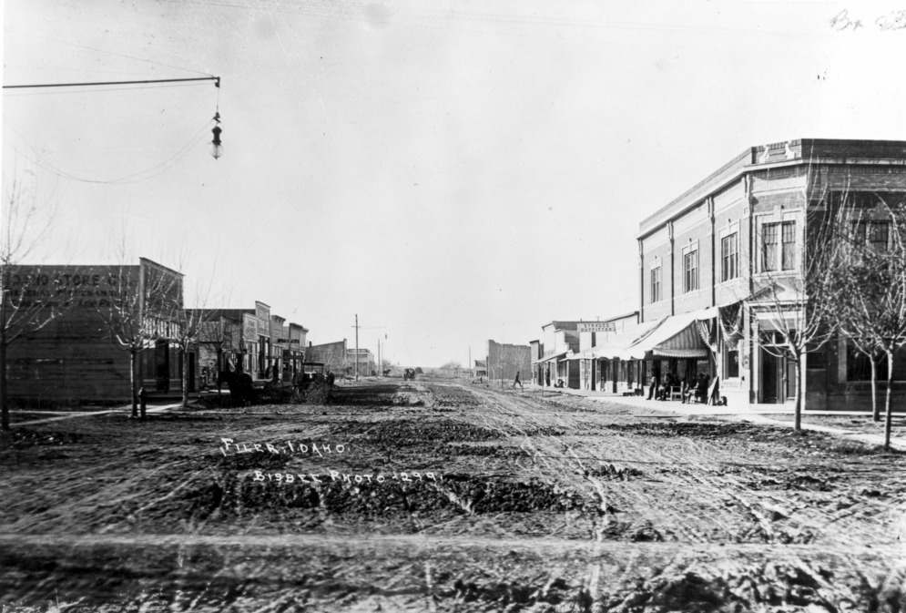 - "Filer, Idaho;" view down unpaved Main Street of Filer. Buildings and businesses visible include: lumber store; Strauss Outfitter; Filer Bank