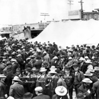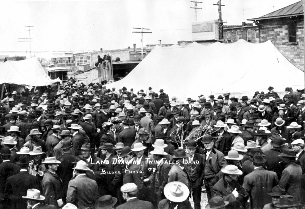 - "Land Drawing, Twin Falls, Idaho;" a large crowd of mostly men stand in front of a canvas tent erected in an alley behind a brick building.