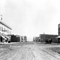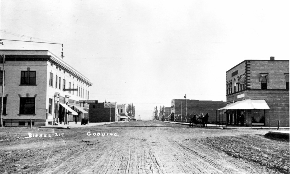 - "Gooding;" view down an intersection with several buildings. Businesses visible include: a bank; hardware store; dry goods; The Toggery, Gent's Furnishings, Clothing, Shoes; Light and Power; a hotel; and the U.S. Post Office.
