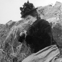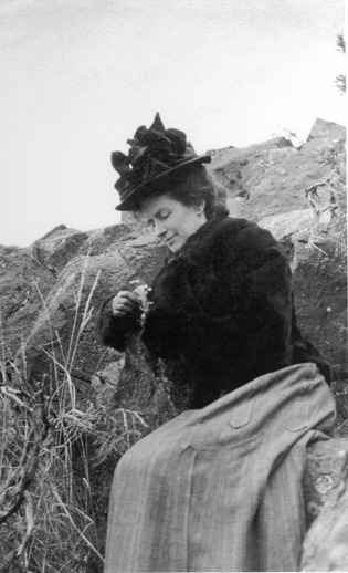 - Jessie Bisbee posing, seated on a rock canyon wall.