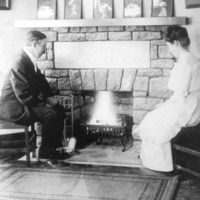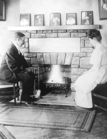 - Clarence and Jessie Bisbee posing for a photo beside their fireplace in the Bisbee Studio. The quote above the fireplace reads, "God's in His Heaven - All's Right with the World."