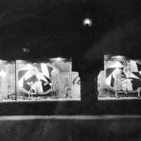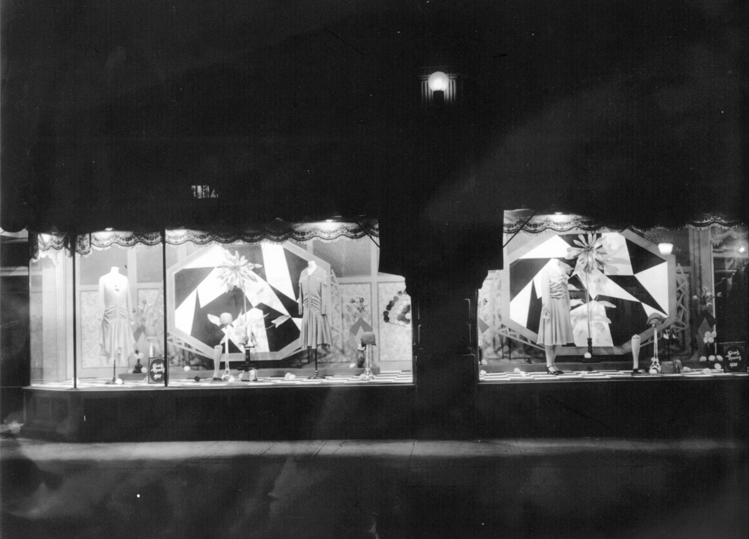 - Display in store windows showing women's clothing and accessories. A sign in one of the windows reads, "Spring Opening 1930."