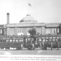 "Twin Falls Railway Company's Cars, Operated by the Edison Storage Battery, Twelve-Mile City and Interurban Loop from Twin Falls to Shoshone Falls, Now Under Construction;" two of the Twin Falls Electric Railway (railroad) cars parked behind the High School.