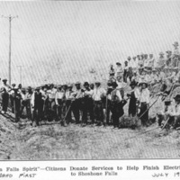- "The 'Twin Falls Spirit' - Citizens Donate Services to Help Finish Electric Railway to Shoshone Falls;" a group of men in dress shirts and hats pose with tools in and on the sides of a depression in the road. {Though attributed to the July 1914 article in "See Idaho First," this is not accurate.}