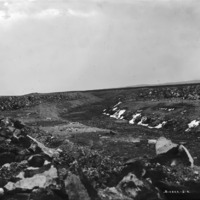 - Wide view of a dry canal bed. Rock fill lines the edges.