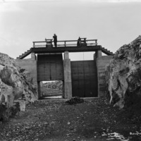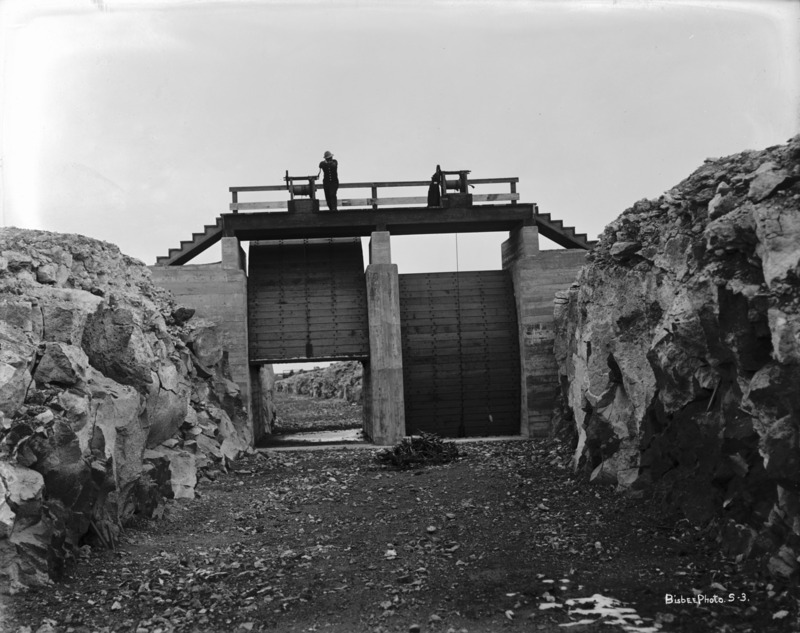 - A man stands atop the gates to an empty section of a canal.