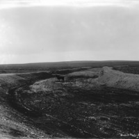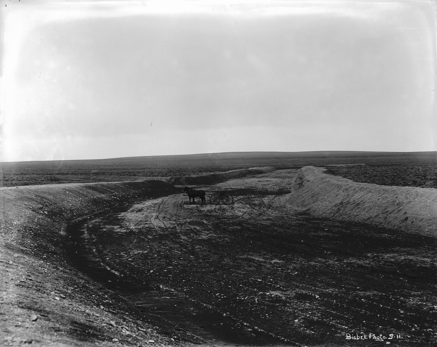 - Wide view of a horse and buggy standing in a dry canal bed..