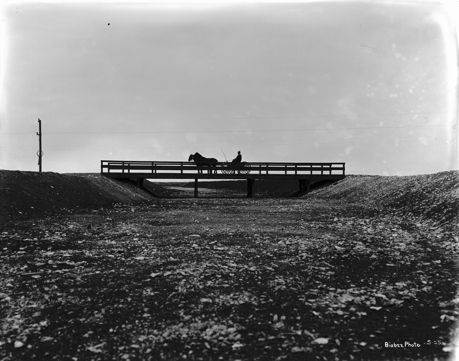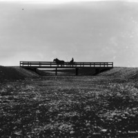 - A man and a two-horse buggy stops on a low bridge across a dry canal.