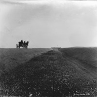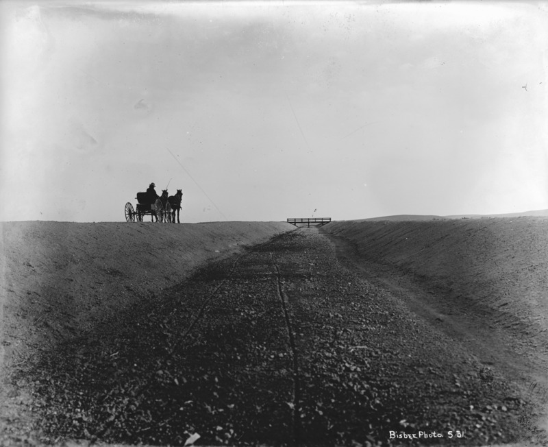 - A man in a two-horse buggy stops on a berm beside a dry canal. Gates are in background.