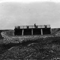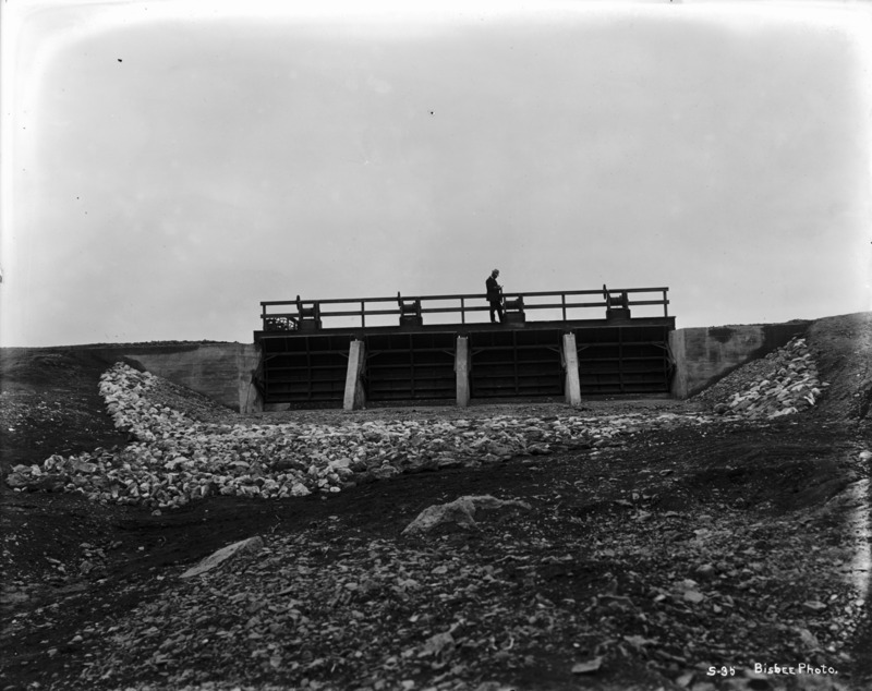 - A man stands atop canal gates over a dry canal bed.