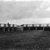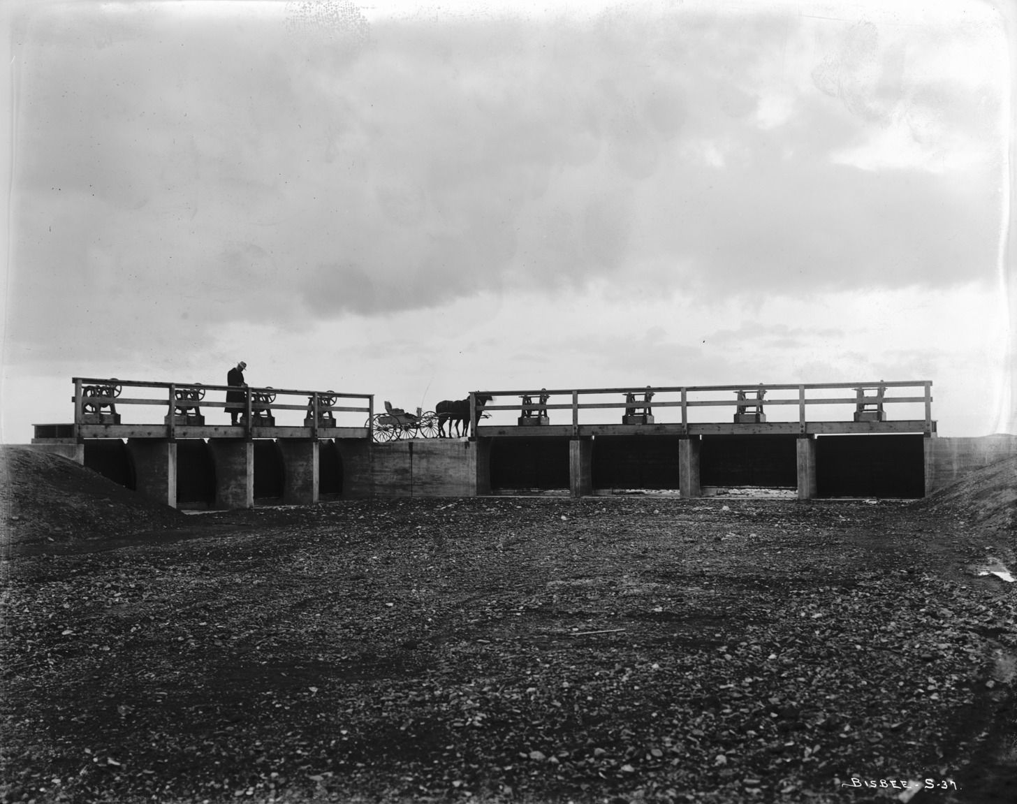 - A man stands atop canal gates over a dray canal bed. A two-horse-buggy stands near the gates.