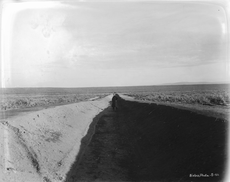 - A man (possibly Clarence Bisbee) stands a a shallow, narrow dry canal channel.