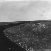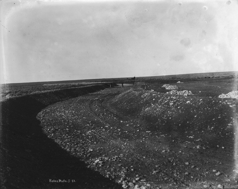 - A two-horse buggy stands on a low bridge over a dry canal bed.