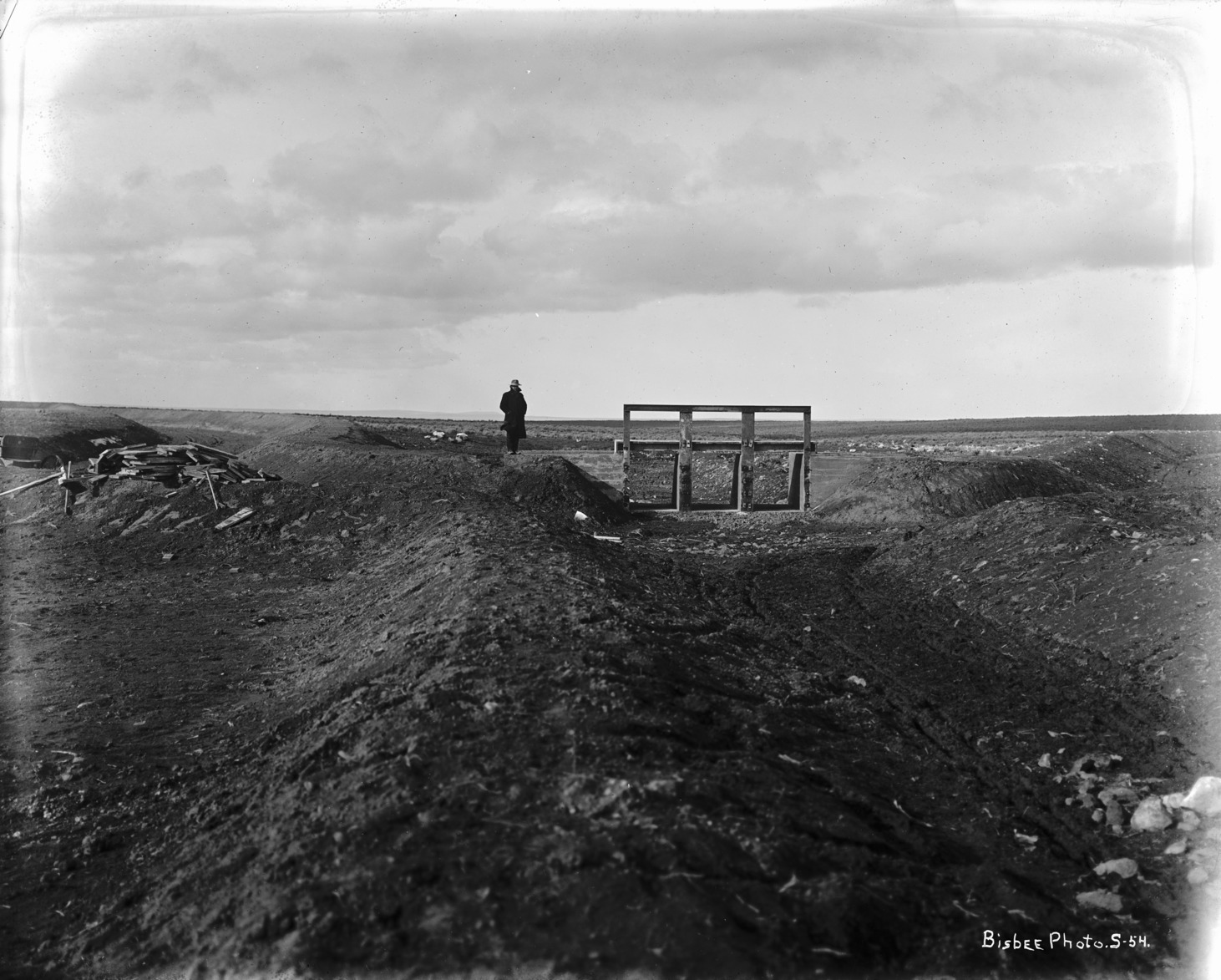- A man stands beside the canal gates on the berm of a dry canal bed.