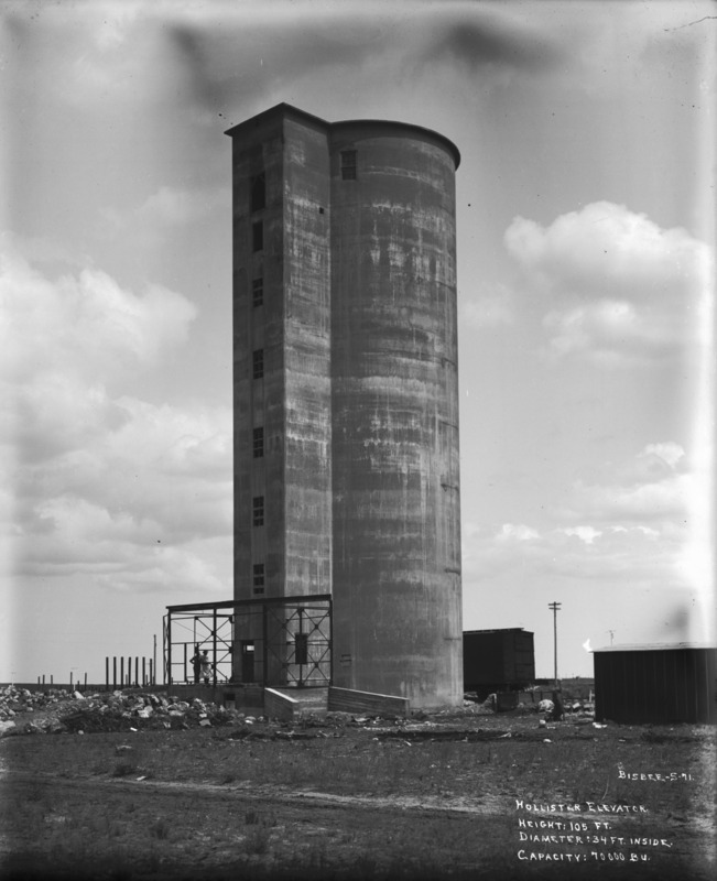 - "Hollister Elevator; Height: 105 ft; Diameter: 34 ft. inside; Capacity: 70,000 bu;" grain elevator near railroad; two men stand near entrance.