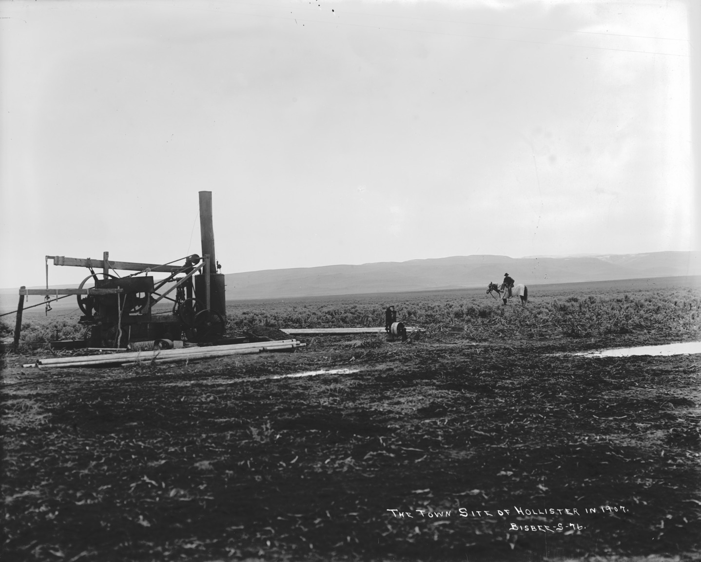- "The Town Site of Hollister in 1907; well drilling equipment in a sagebrush plain. A man on horseback looks on from the center of the photograph.