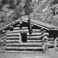 - A log cabin situated at the base of a canyon wall
