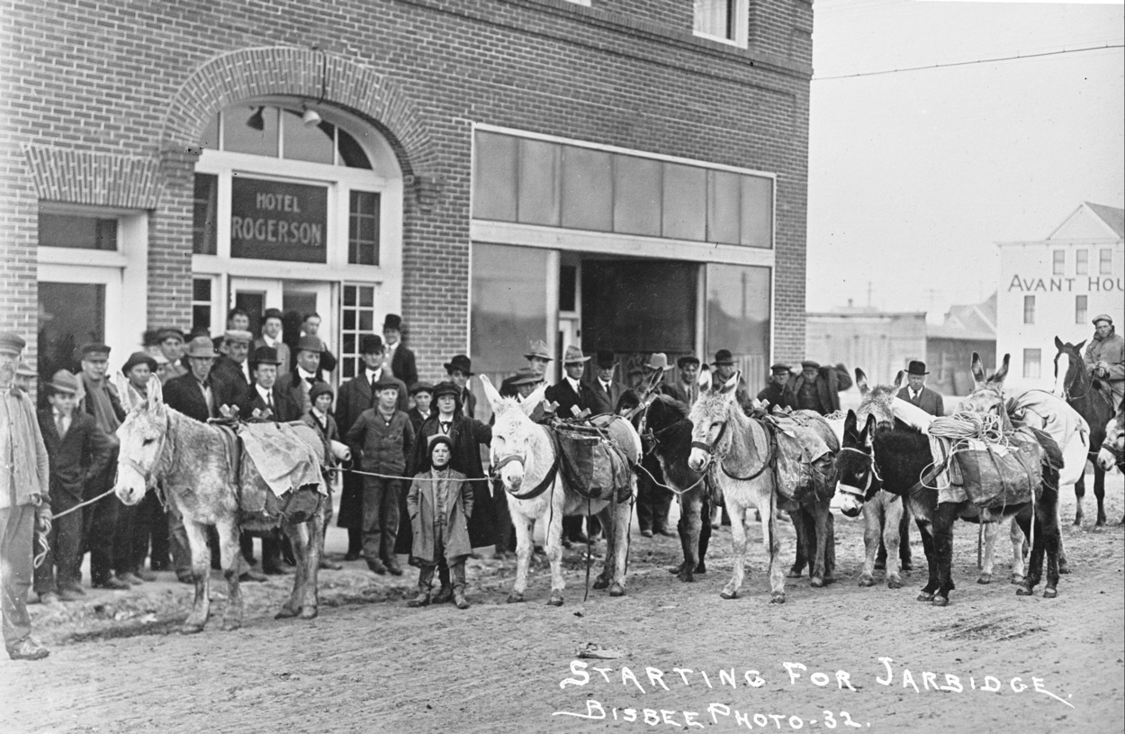 - "Starting for Jarbidge;" men and boys alongside a mule train in Twin Falls, outside the Rogerson Hotel, Avant House in background.