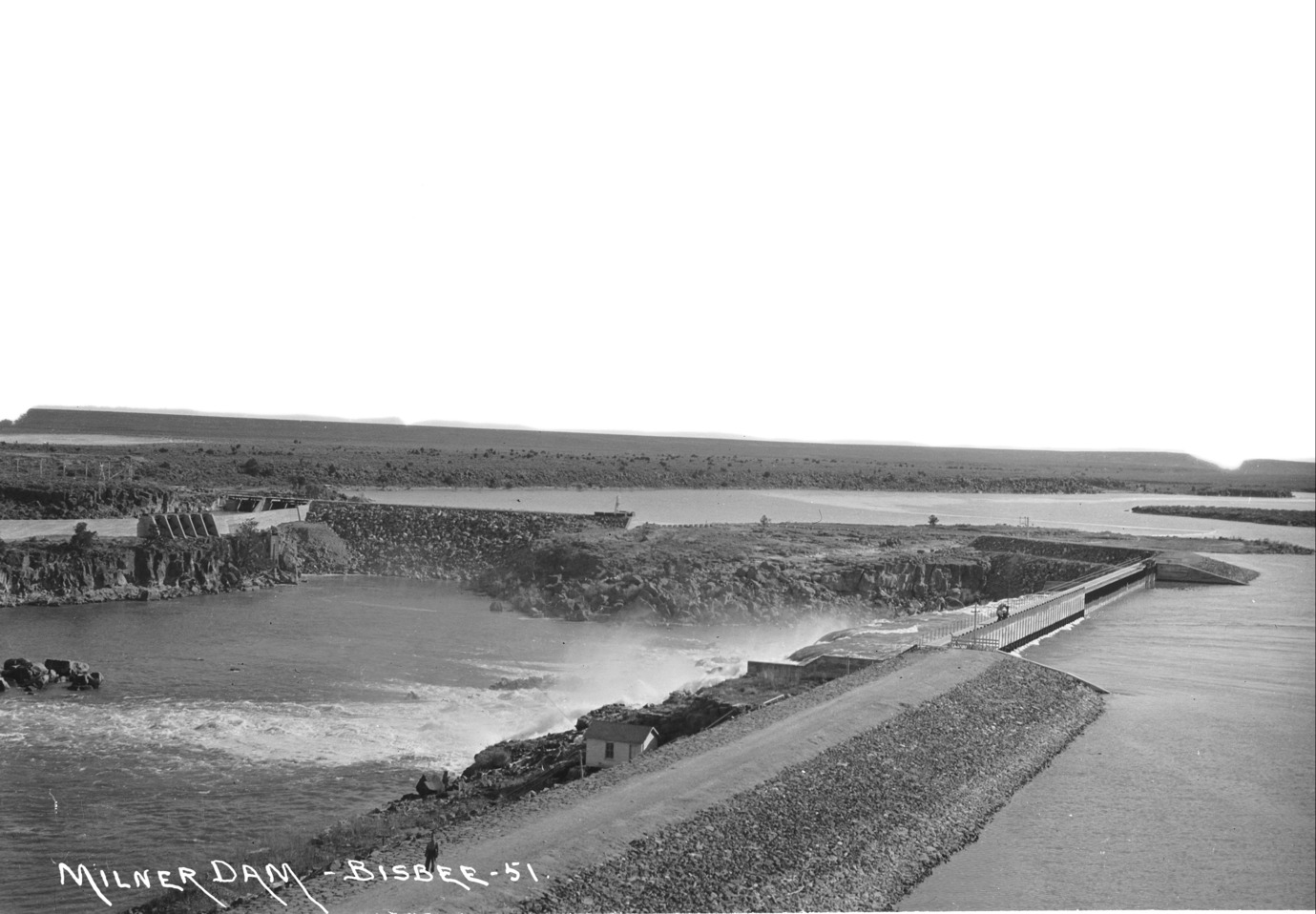 - "Milner Dam;" view from above the gates of the dam. A man stands on the berm.