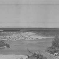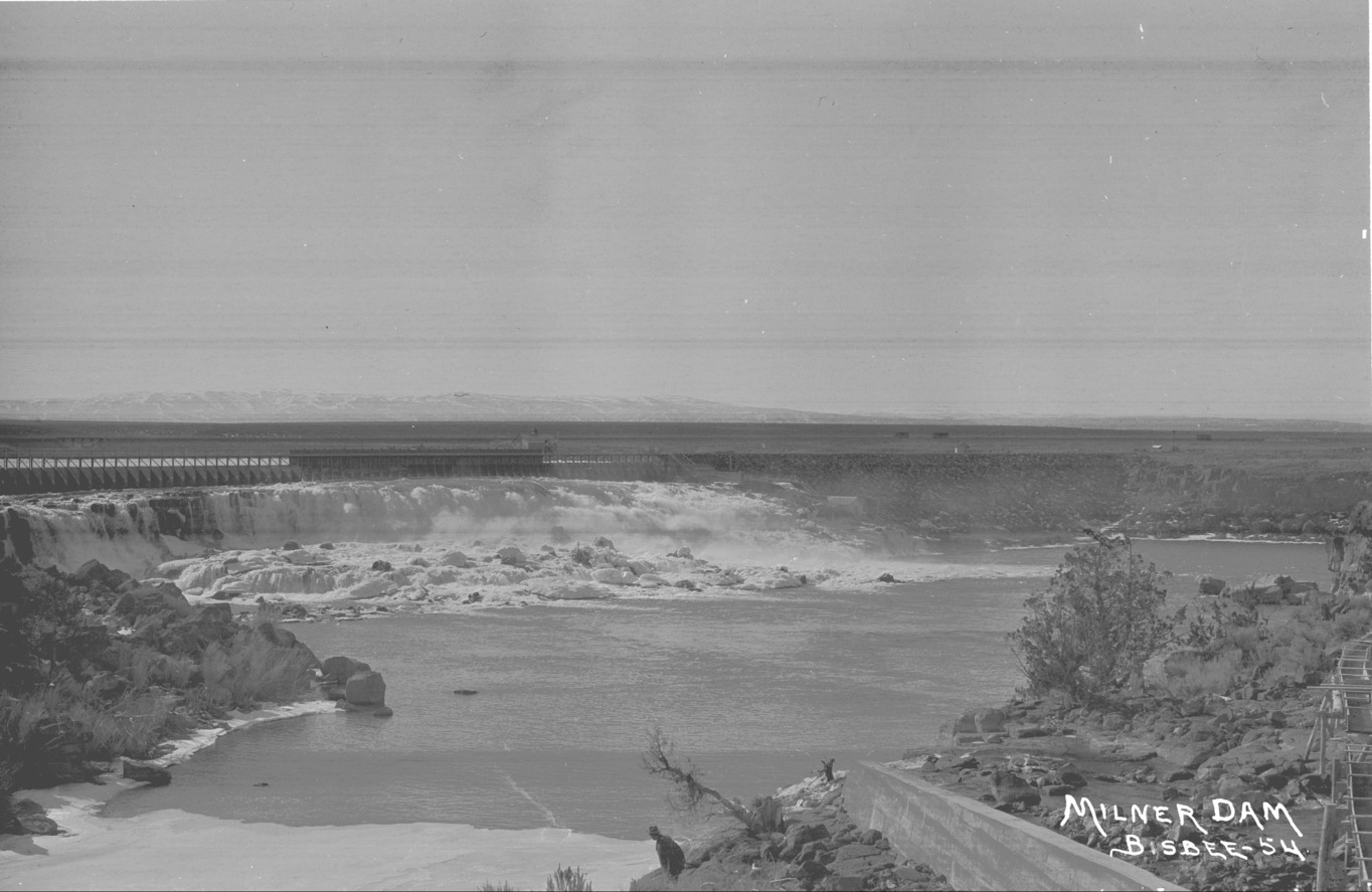 - "Milner Dam;" wide view of gates; man stands on bank in the foreground. Ice covers some of the water.