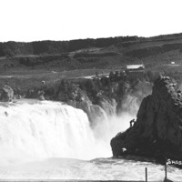 - "Shoshone Falls;" close-up view of the Falls, with a man climbing the rocks in foreground right. The Hotel, power lines, and outbuildings can be seen on the south side.