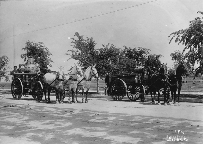 - Fire Department.; Views of horse-drawn fire equipment, and firemen also in the photo.