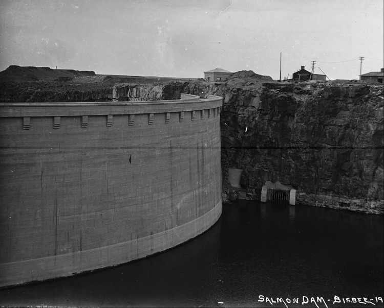 - "Salmon Dam;" showing the reservoir side; buildings in background.