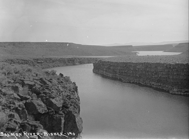 - "Salmon River;" long view of Salmon Falls Creek; a bridge connects the banks of the canyon in the center of the image.