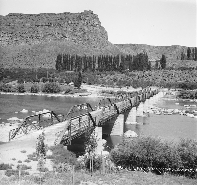 - "Blue Lakes Bridge;" looking across the bridge at the Perrine Ranch from the south side of the Snake River.