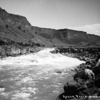- "Auger Falls;" a man and boy, seated on rocks on the bank at the right, watch the rapids.
