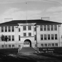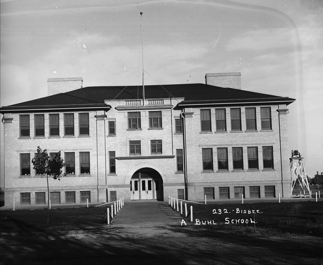 - "A Buhl School;" two-story brick and stone schoolhouse in Buhl ; a large bell on a wooden platform is on the side of the school.