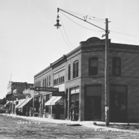 - "Gooding;" view of one side of Main Street in Gooding. Businesses and buildings visible include: The Toggery; Light and Power; The McIntosh Drug Store; Byers's Bakery and Café Confectionery; Star Restaurant; Madeline Hotel. A man and woman peer into one of the windows of the corner building.