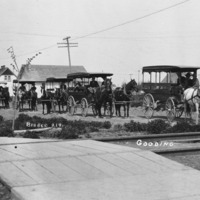 - "Gooding;" wagons, horses, and their drivers line a street. Several houses in the background, with a wooden boardwalk (sidewalk) and railroad tracks in the foreground.