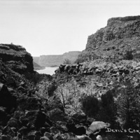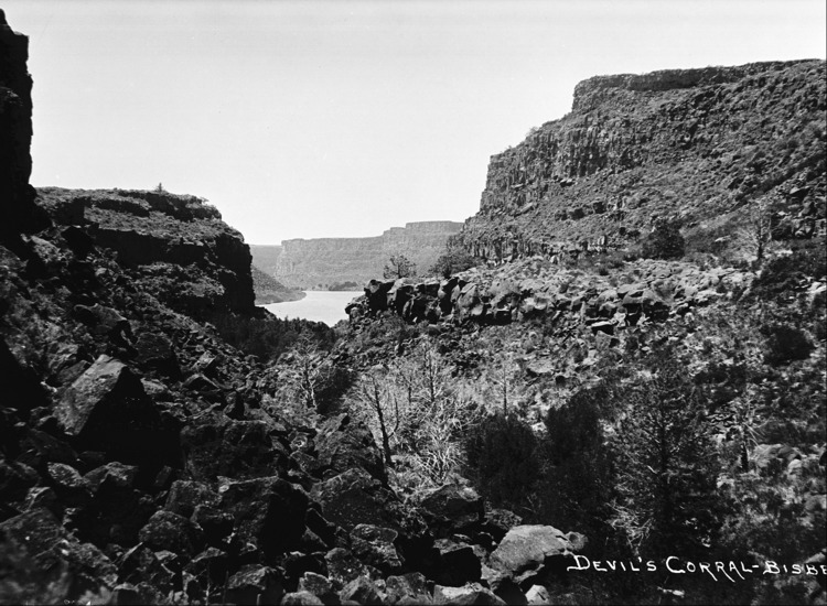 - "Devil's Corral;" view from the bottom of Devil's Corral looking west toward the Snake River.