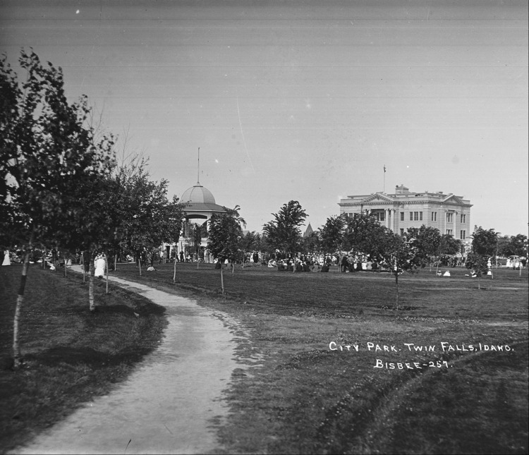 - "City Park, Twin Falls, Idaho;" many people gathered near the band stand (gazebo); County Court House in the background.