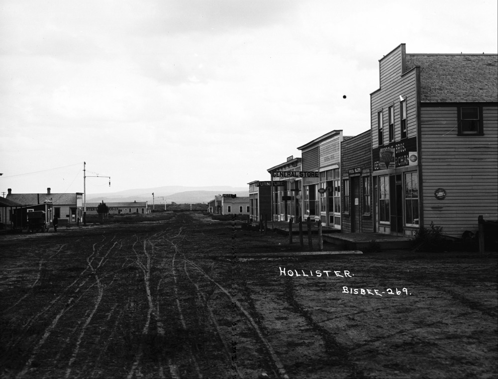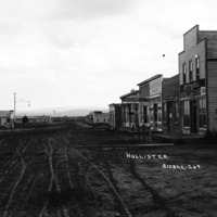 - "Hollister;" buildings along the main street; Businesess and buildings visible include: restaurant, hotel, furniture, general store, general merchandise.