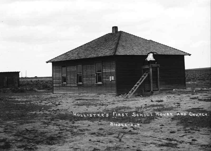 - "Hollister's First School House and Church;" a one-story wooden frame building. A bell on a platform is at the rear, with a ladder leading to the top. A smaller outbuilding is on left.
