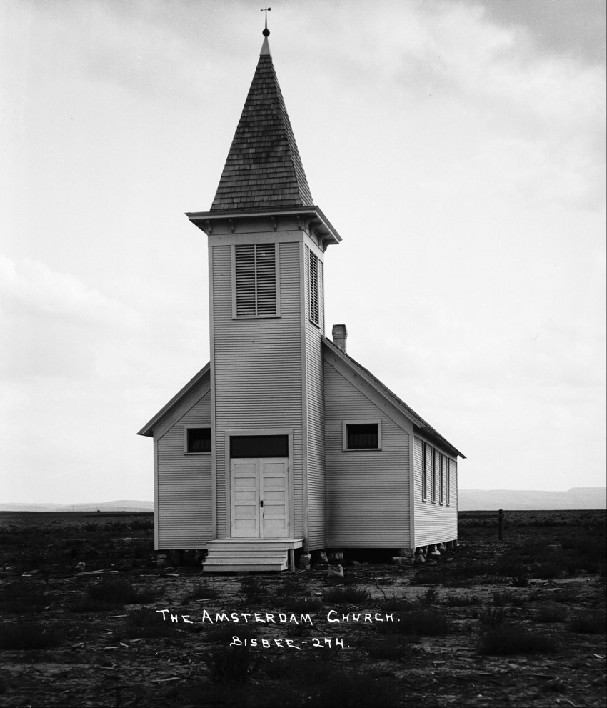 - "Amsterdam Church;" plain wood church with tall steeple.