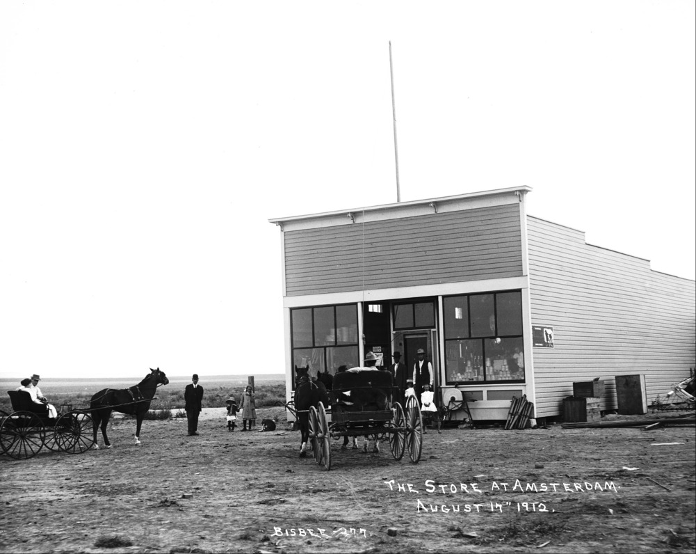- "The Store at Amsterdam. August 17th, 1912;" a wood frame general store with two buggies, with horses, and several people standing in front of and next to building.