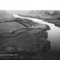 - "Blue Lakes Farm;" Perrine Ranch area of the Snake River canyon, from the rim, showing the first Perrine Bridge.