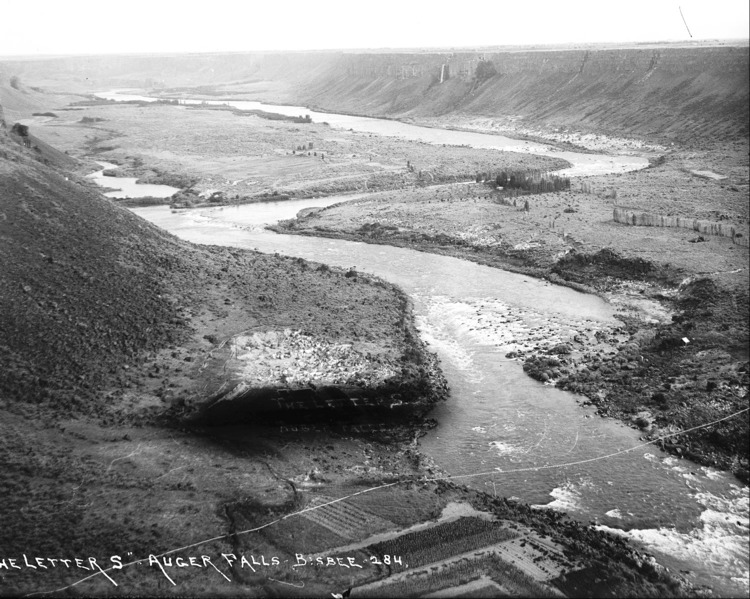 - "The Letter S - Auger Falls;" the Snake River curving through the canyon, Blue Lakes area in background