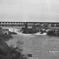 - "American Falls;" view of power plant buildings and bridge above dam.