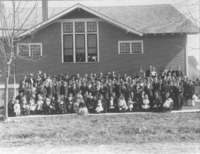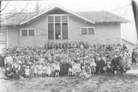 GB 016 Group of people, children and adults, posed outside the First Christian Church. {Other denominations that used the building included the Immanuel Lutheran Church, Grace Baptist Church, Gospel Temple Church, and Reformed Church,}