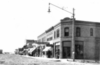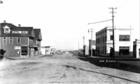 GB 008 "Filer, Idaho;" view down unpaved Main Street of Filer. Buildings and businesses visible include: lumber store; Strauss Outfitter; Filer Bank