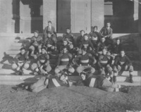 GB 023 Twin Falls High School football team pose on the steps of Bickel School. Top row: B. H. (Bruce) McMillan, Manager; E. R. Dooley, coach (?). 2nd row: Dave Girdner; Rex Bailey; Jake (Jacob) Sinema; Orval Blades; Chas (Charles) Montgomery. 3rd row: Dana Elliott; Glenn Fitzpatrick; Curtis Bowers; Roy Weaver. 4th row: Cleve Costello; Sid McDonald; Harry Knight; Dan Adams; Rollo Crater; Chet Oakley. 5th row: Chas (Charles) Younger; Eugene Meigs